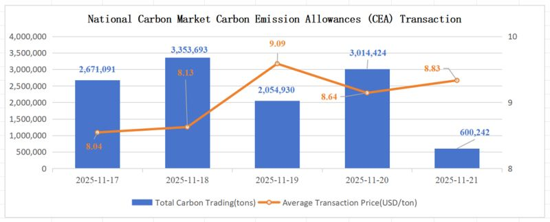 During November 17 – November 21, the total transaction volume of Carbon Emission Allowances (CEA) in Chinese National Carbon Market reached 11,694,380 tons, with a total transaction value of USD 98,765,124.03. The highest price was USD 9.09/ton, and the lowest price was USD 8.04/ton. For bulk agreement transactions, the volume was 7,845,864 tons, with a transaction value of USD 63,532,594.02.