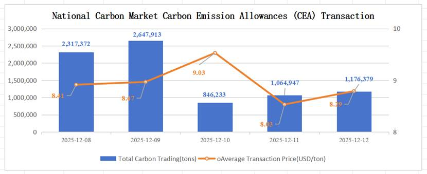 During November 10 – November 15, the total transaction volume of Carbon Emission Allowances (CEA) in Chinese National Carbon Market reached 8,052,844 tons, with a total transaction value of USD 67,864,972.38. The highest price was USD 9.03/ton, and the lowest price was USD 8.03/ton. For bulk agreement transactions, the volume was 4,870,531 tons, with a transaction value of USD 41,411,205.81.