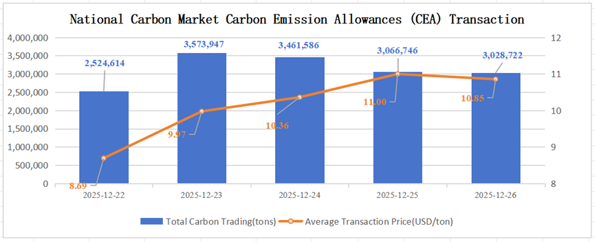 During December 22 – December 26, the total transaction volume of Carbon Emission Allowances (CEA) in Chinese National Carbon Market reached 15,655,615 tons, with a total transaction value of USD 160,062,685.31. The highest price was USD 11.00/ton, and the lowest price was USD 8.69/ton. For bulk agreement transactions, the volume was 11,800,947 tons, with a transaction value of USD 119,490,245.41.